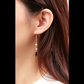 ジェットスワロフスキーと淡水パールの組み合わせが耳元で美しく輝き、落ち着いた雰囲気を引き立てます。