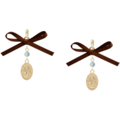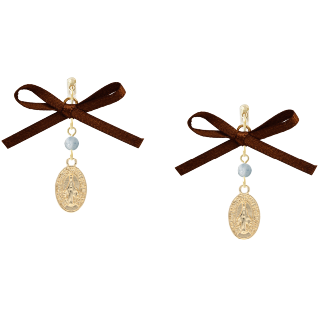 煌めくアクアマリン、リボンモチーフとメダイチャームが絶妙に組み合わさった、華やかさと女性らしさを演出する一品です。